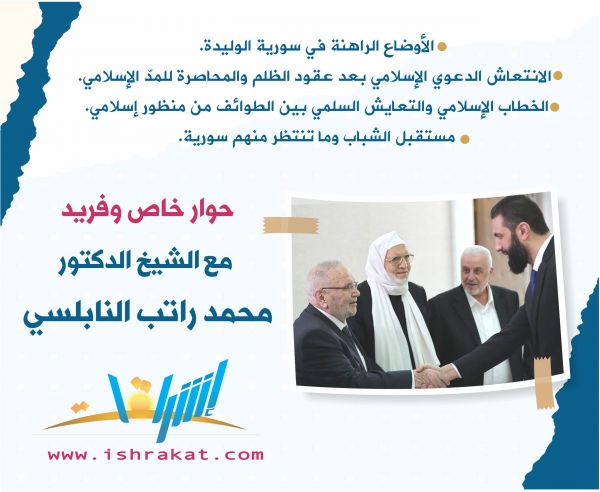 وسط تحوُّلاتٍ عاصفة، وإرثٍ ثقيلٍ من المعاناة، أجرى مدير تحرير مجلة إشراقات حوارًا صريحًا وخاصًّا مع الشيخ الدكتور محمد راتب النابلسي، مقاربًا لحظةً مفصلية في تاريخ سورية، بين قراءةٍ واعية للواقع، واستشعارٍ لمسؤولية المرحلة...